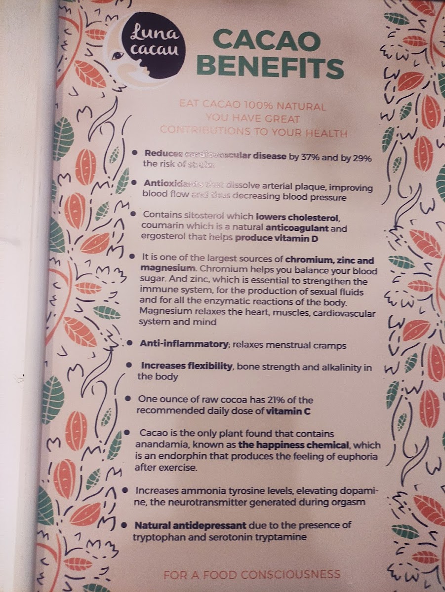 “ It was my first time trying cacao and it was a delightful experience. The owner Nora knows the health and medicinal properties of the drink inside and out. Will definitely be back to try other all the flavors and variations of cacao - the food of the ”